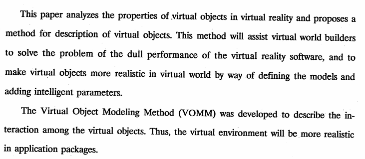 本研究分析虛擬實境(virtual reality)中虛擬個體(virtual object)的特性並提出一個描述方法,藉由這個描述方法能幫助虛擬世界建構者解決大部分虛擬實境系統中軟體(software)部分表現過於呆板的問 題,讓虛擬個體能藉由更智慧(intelligent)化的表示方式顯得更接近真實。研究中首先針對虛擬實境系統中對於虛擬世界中個體的表現能力加以分 類,根據這些分類找出可能的特徵及描述方式,然後定義出合適具體的模型(modeling)方法來描述這些特徵,並為這個模型方法加入智慧化的參數(parameter),讓虛擬個體表現地更為真實。 為了便於對各個體模型化結果的表達,本研究設計了一套適合於表示這些模型化參數的方法VOMN(Virtual Object Modeling Method),藉由這套方法的協助,虛擬實境設計者(designer)可以很容易地描述美一個虛擬個體本身的特徵以及虛擬體間的交互作用 (interaction),讓整個虛擬實境的應用在軟體方面也能更為趨進真實。整個模型化的結果,也使得從事模擬(simulation)、人工生命 (artificial life)及情境教學設計方面研究工作者能有更方便確實的工具可茲利用。