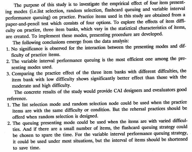 本研究旨在探討練習式CAI中不同選題策略(串列、隨機、閃爍卡式佇立及變數式題距表現佇立等四種)對練習效果的影響。練習內容係以英語同義字或詞為題材,初擬之題目經項目分析後,區分為低、中及高三種難度水準之練習題,且以此等題目建立題庫,提供線上練習。 經以60名大一學生在三種難度題庫下進行四種選題策略之線上練習教學,間隔一週後,受試者在線上受測後所獲得之資料,經分析之結果獲得以下結論: 1.練習式CAI練習題之選題策略(如串列,隨機,閃爍卡式佇立及變數式題距表現佇立等選題策略)與題庫中所含練習題之難度(如低難度、中難度及高難度)間並無交互作用存在。 2.就練習CAI練習題之選題策略而言,選題策略的確會影響練習效果。其中以變數試題距表現佇立選題策略之練習效果最佳,閃爍卡式佇立選題次之,串列選題再次,而隨機選題之練習效果之影響最小。 3.就題庫中所含練習題之難度觀之,無論使用何種選題策略,均以低難度題庫之練習效果最佳,高難度題庫之練習效果較差,此結果符合一般的看法。 本研究並根據設計上之經驗及實徵之結論,提供下列建議: 1.在題庫中所含練習題之難度相同或相當的情況下.可使用「串列」及「隨機」兩種選題策略.唯在設計隨機選題策略時.應預先設定每一題有「重複」練習的機會。 2.在題庫中所含練習題之難度不同或難度之分布很廣的情況下.可使用「佇立式」選題策略。當所欲練習之題目不多時.可利用閃爍卡佇立式選題策略.以避免因過多的強迫練習機會而花太多的時間。至於「變數式題距表現選題策略」,在大部分的情況皆可使用,為所設定之題距之位置不宜太多,以免使用太多時間。