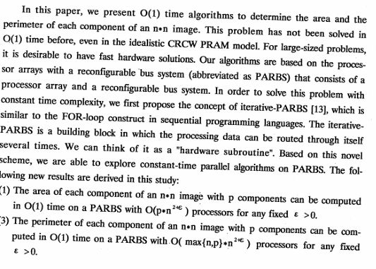 在本論文中,我們提出O(1)時間的演算法,以求出一n*n影像每一個元件的面積及周長。此問題以前從沒有在O(1)時間內被解決過,即使是在即理想的CRCW PRAM計算模型上。就大型的問題而言,我們需要快速的硬體方案。我們的演算法乃使用可重組態匯流排系統之處理器陣列(簡稱PARBS),它含有一處理器陣列以及一可重組態匯流排系統。為了能以常數時間之複雜度解決此問題,我們先利用inerative-PARBS的設計觀念〔13〕,類似循序程式語言中的FOR迴圈,使處理中的資料能夠迴繞數次(固定次數),我們可將之視為一種硬體的副程式。根據這種特別的架構,我們得以在PARBS發展出常數時間的平行演算法。以下是我們所得到的心結果: (1)一具有p個元件之n*n影像每一個元件的面積,可在一含有O(p*n2+ε)個處理器之PARBS上,以O(1)時間球出,此處ε>o。 (2)一具有p個元件之n*n影像每一個元件的周長,可在一含有O(max{n,p}*n2+ε)個處理器之PARBS上,以O(1)時間求出,此處ε>o。