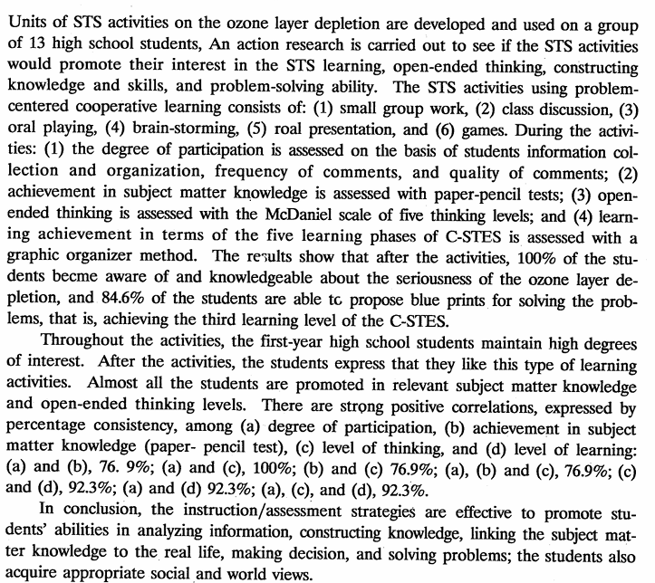 本研究設計”臭氧層破洞”STS單元,採行動研究法,試探這些STS單元是否有效的提升學生對有關主題的學習興趣、知能、開放性思考及解決問題的能力。STS單元使用問題為中心的合作學習包括:(1)小組研究(2)班級討論(3)角色扮演(4)腦力激盪(5)口頭陳述(6)益智遊戲。活動中使用:(1)紀錄發言次數及內容與蒐集整理資料來評量學生的參與度(2)學科知識測驗評量相關之事學習成就(3)以McDaniel的五個思考階層評量學生開放性思考階層(4)以學習層次評量學生的組織圖形。評量結果顯示100%學生都能察覺、了解臭氧層破洞問題之嚴重性,並有84.6%學生能提出方案、解決問題,即達到C-STES之第三學習層次。 在活動過程中學生(高一)都能保持高度的興趣,活動後學生均表示相當喜歡這樣的學習活動。幾乎所有的學生對相關學科之事都有明顯的進步,其開放性思考也都提升到高的階層。各項評量間有著高度的正相關(a)參與度(b)學科知識測驗成績(c)開放性思考(d)學習層次:(a)與(b)的正相關為76.9%;(a)與(c)的正相關為100%;(a)與(d)的正相關為92.3% ;(b)與(c)的正相關為76.9%;(b)與(d)的正相關為69.2%;(a)與(d)的正相關為92.3%;(a)與(d)的正相關為92.3%;(a)、(b)與(c)的正相關為76.9%;(a)、(c)與(d)的正相關為92.3%。此活動分析結果顯示,本教學/評量策略對提升學生的分析資料、建構知識、作決策和解決問題等能力及使學生擁有正確的社會觀、世界觀是有效的。