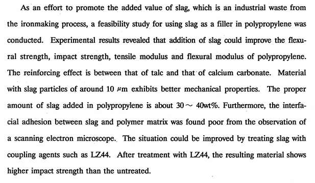 為能提升煉鋼廠水淬爐石(slag)的實用價值,本研究進行爐石作為聚丙烯塑膠添加劑的評估。實驗結果顯示爐石的添加,將提升材料的彎曲強度、耐衝擊強度和拉力、彎曲模數。爐石的補強效果,介於滑石粉與碳酸丐粉之間。粒徑小者(約10μm)具有較佳機械性質,教室當的爐石添加量為30~40wt%。另外, 從電子顯微鏡的觀察得知爐石粉與基材的界面接著不佳,但可經偶合劑如LZ44的處理來改善,同時改善後之材料在耐衝擊強度方面有顯著的增加。
