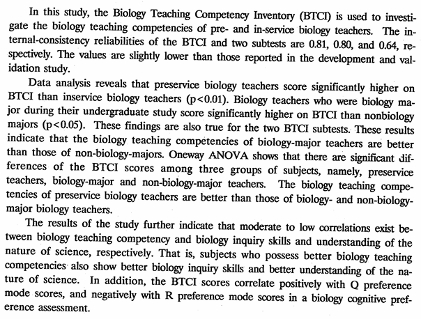 本研究以「生物教學能力測驗」(BTCI)為研究工具,探索職前及在職生物教師之生物教學能力素養。BTCI與所含兩分測驗的內部均質性信度分別為0.81,0.80,和0.64,略低於BTCI發展與效化時的信度值。 研究的結果顯示,職前生物教師的生物教學能力顯著優於在職之生物老師(p<0.01)。主修生物之在職生物教師,其BTCI整體測驗的分數顯著高於 非主修生物之在職生物教師(P<0.05);這種情形,在兩個分測驗的得分方面亦然。這個結果顯示,主修生物的教師,生物教學能力素養顯著優於非主 修生物的教師。變藝術分析的結果顯示,職前生物教師、主修生物的在職教師和非主修生物的在職教師三群樣本,生物教學能力素養有顯著差異,職前生物教師之生 物教學能力顯著優於主修生物與非主修生物之在職教師。 此外,研究的結果亦顯示,生物教學能力與生物探討技能和對科學的本質的了解兩項教師特性之間,分別有中度至低度相關存在,及生物教學能力較佳的教師,其生物探討既能和對科學的本質的了解亦較佳。此外,生物教學能力與生物認知偏好的Q(批判質疑)形式之間亦有顯著的正相關,而與R(記憶)型式之間則有顯著之 副相關存在。