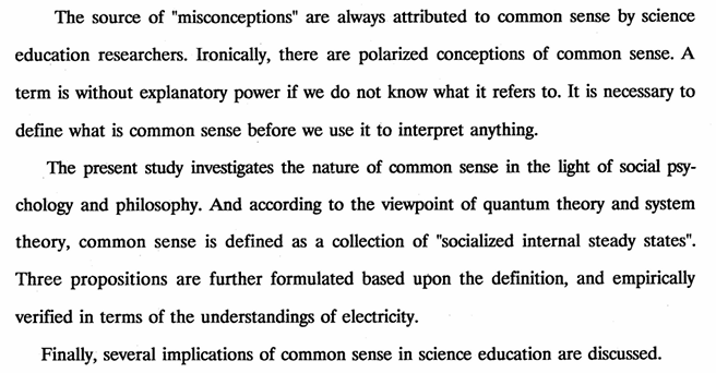 科學教育學者常將「迷思想法」(misconceptions)歸因於常識,但對常式的意義及本質卻持兩極化的不同見解。一個未經定義的辭彙不具有詮釋力;如果要以常識解釋「迷思想法」,則常識意義的釐清是極為重要的工作。本文從科學教育、社會心理學、以及哲學的觀點,探討常識的本質,進而由控制論的角度,將常識定義為「社會化的內穩態」。根據這個定義,推論出三個關於「迷思想法」的命題,並以基本電學概念的理解,檢視這些主張的合適性。根據這個新的定義,本文也討論常識對於科學教育的意涵。