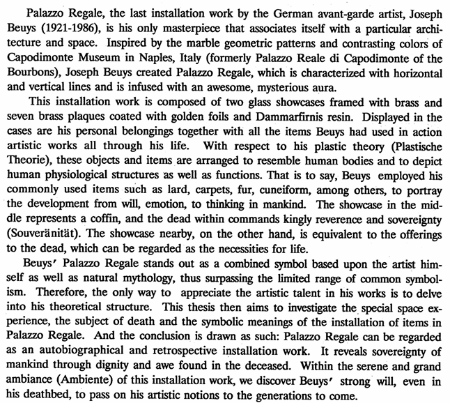 德國前衛藝術家Joseph Beuys(1921-1986)生前最後一件裝置作品「王宮」(Palazzo Regale)為其作品中唯一與特定場地的建築及空間密切結合的作品。Beuys因應義大利那不勒斯(Neapel)Capodimonte美術館(前波 旁王朝(Boourbone)的夏宮Palazzo Reale di Capodimonte)大理石地面的幾何圖形及強烈的色彩,創作出以水平及垂直線條為主,充滿莊嚴及神秘氣氛的Palazzo Regale。 此件作品由兩個鑲塗上金色的黃銅玻璃櫥窗及七個刷上溶於達麻樹脂漆的金箔的黃銅板組成。櫥窗之內陳放Beuys歷年來不同行動藝術中所使用過的道具及其私 人物品。所有這些道具及物品均依照Beuys所慣用的物品如油脂、氈、毛皮、楔形等符號表達出來。位於中間的櫥窗象徵著棺槨,其內的死者具有國王般的尊容 與自主權。位於測邊的櫥窗澤相當於陪葬品,是人生之旅不可或缺之物。 Beuys的Palazzo Regale因結合其個人的與自然神話(Naturmythos)的象徵,而超乎一般固有象徵的範圍,故唯有進入其個人的思考體系之內,方能掌握其作品之 真諦。本文分析Beuys此件作品中特殊的空間體驗、死亡的主題與各裝置物品的象徵意義後之結論為:此乃一件自傳體回顧式的裝置作品,以死者擁有君王之 尊,強調人類的自主權,在寧靜而恢弘的氛圍裡(Ambiente),臨死的Beuys至終不忘以傳播藝術理念為己任。