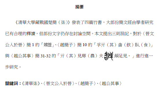 關鍵詞:《清華柒》;〈晉文公入於晉〉;〈趙簡子〉;〈越公其事〉