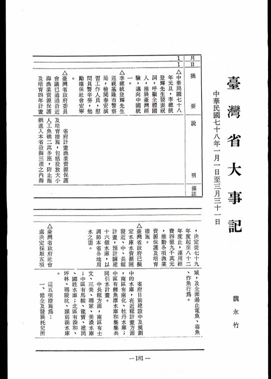 臺灣省大事記(七十八年一月一日至三月三十一日)