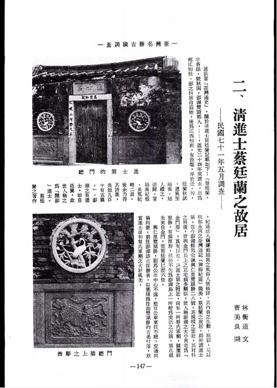 臺灣名勝古蹟調查(連載)二、清進士蔡廷蘭之故居