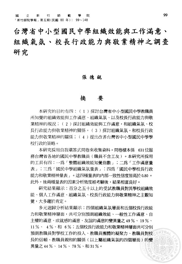 臺灣省中小型國民中學組織效能與工作滿意、組織氣氛、校長行政能力與敬業精神之調查