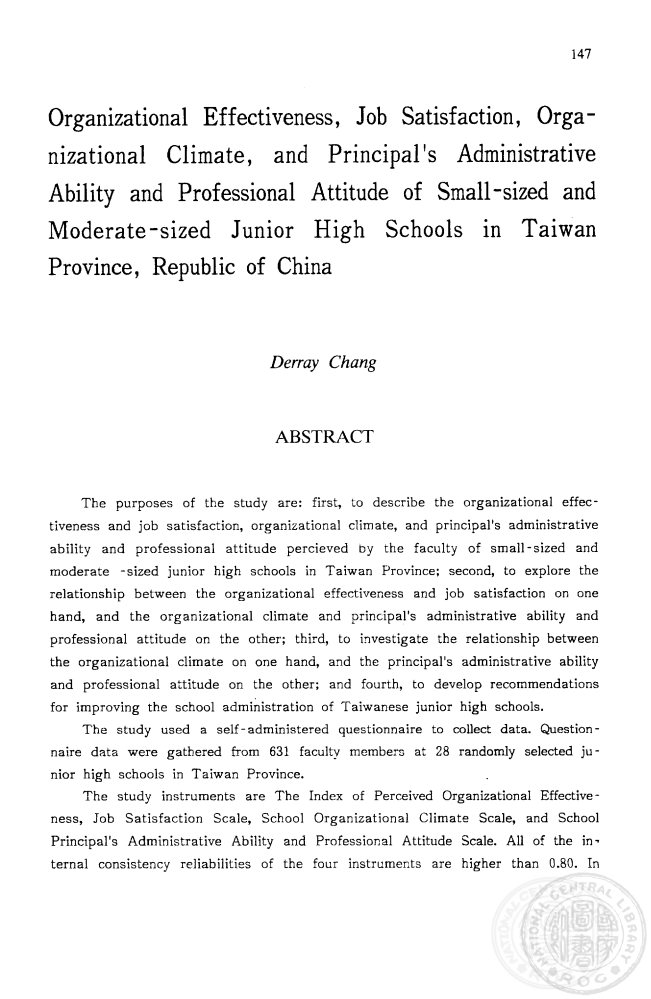 Organizational Effectiveness, Job Satisfaction, Orga¬ nizational Climate, and Principals Administrative Ability and Professional Attitude of Small-sized and Moderate-sized Junior High Schools in Taiwan Province, Republic of China