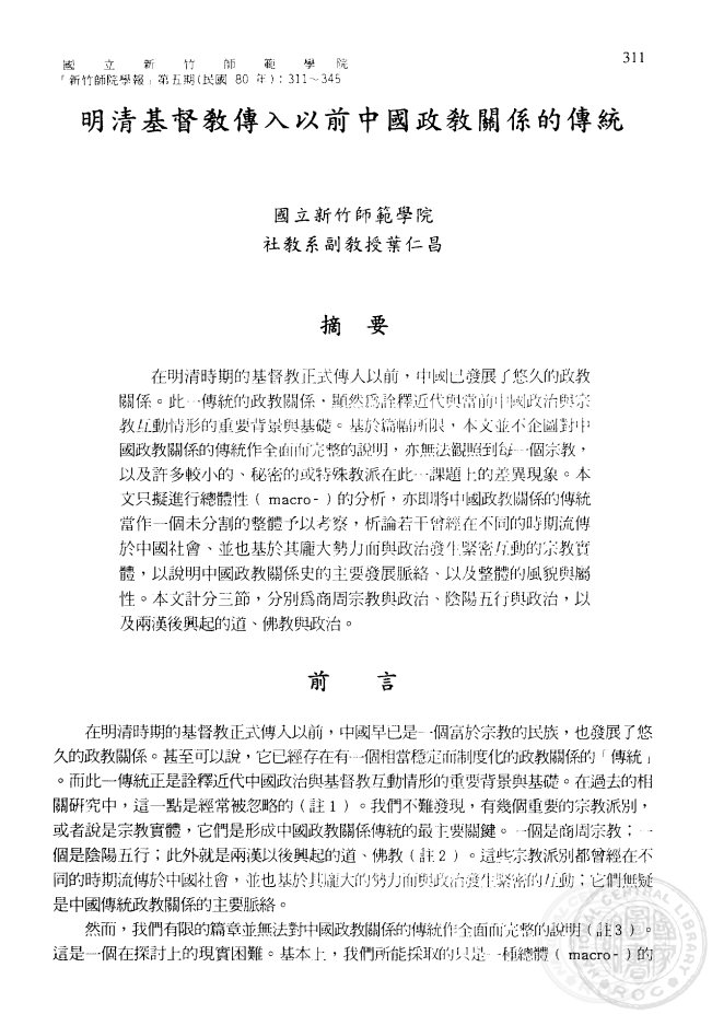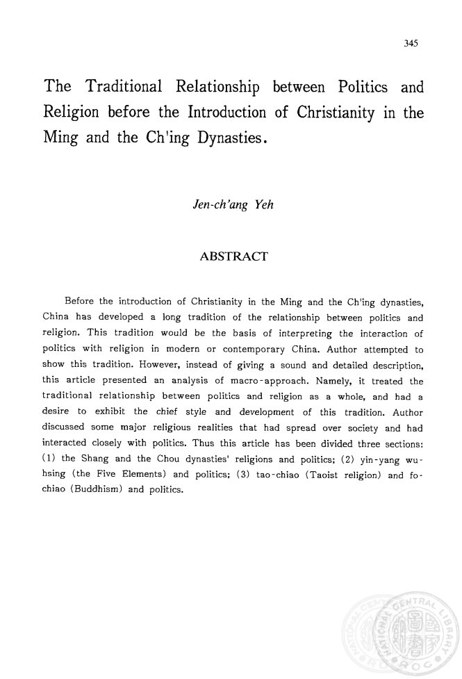 The Traditional Relationship between Politics and Religion before the Introduction of Christian y in the Ming and the Ch'ing Dynasties